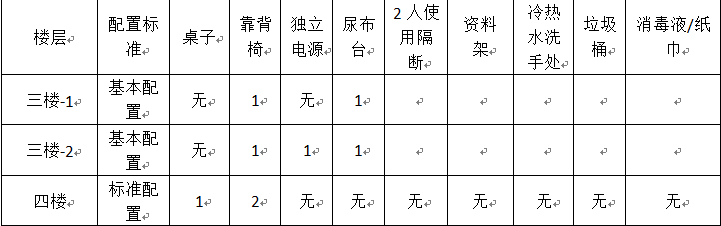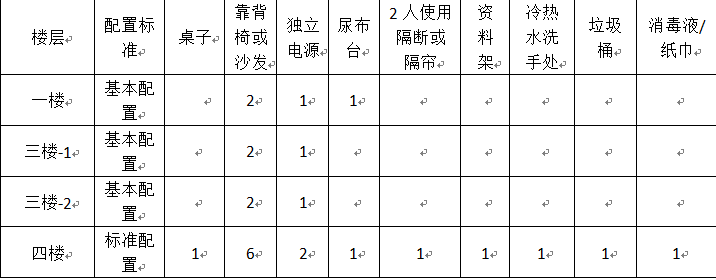 要求,一楼增设母乳喂养室,三四楼母乳喂养室进行规范设置,增设需求要求详见下表: