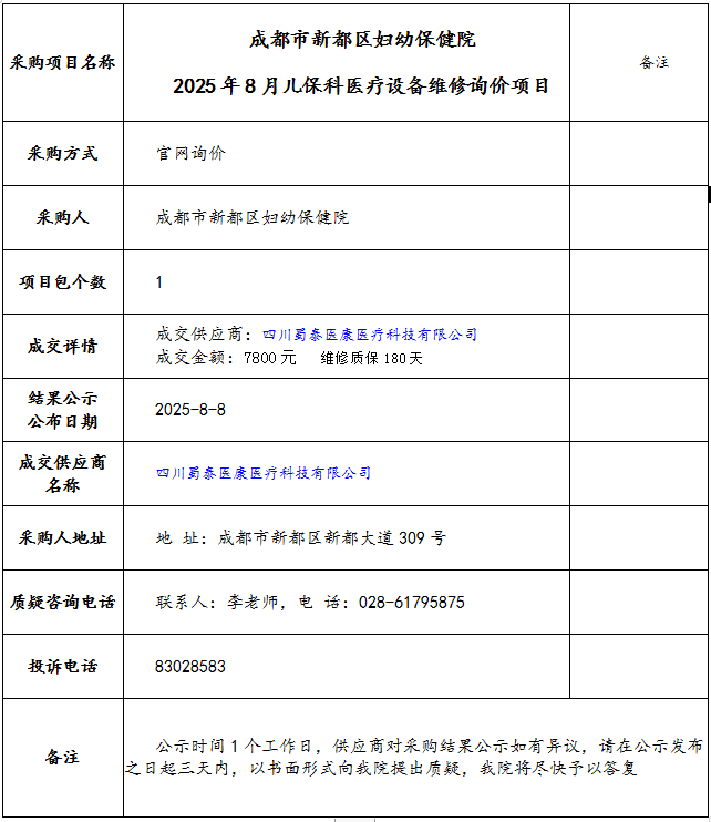 成都市新都区妇幼保健院 2025年8月儿保科医疗设备维修询价结果公示