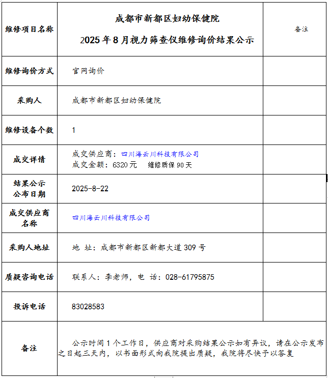 成都市新都区妇幼保健院 2025年8月视力筛查仪维修询价结果公示