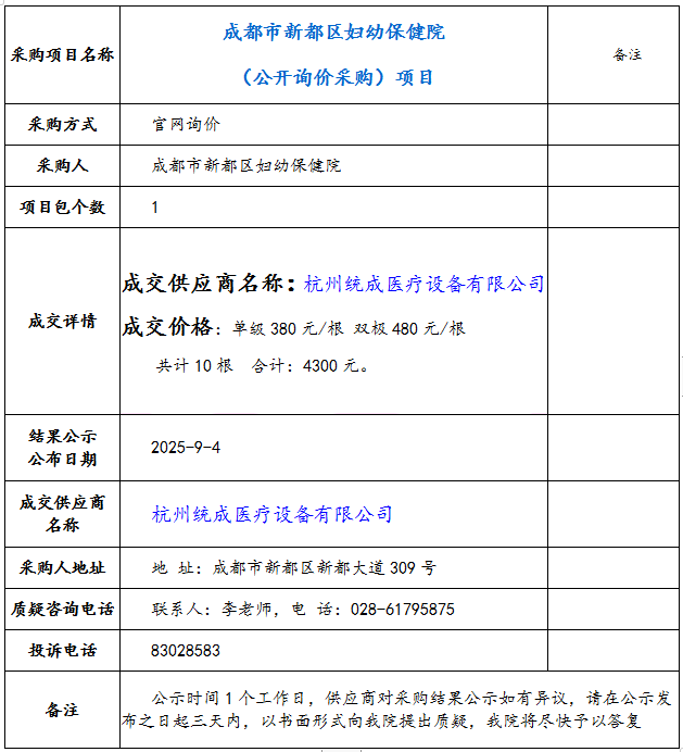 成都市新都区妇幼保健院 官网询价采购结果公示