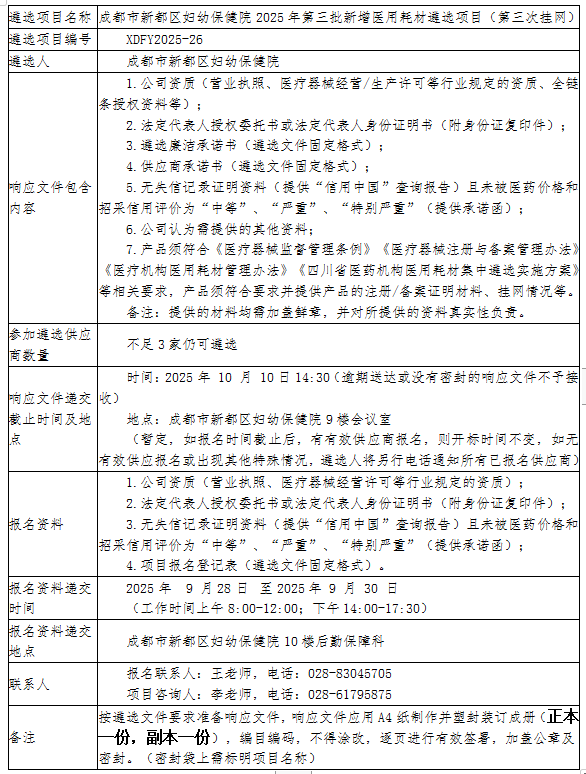 成都市新都区妇幼保健院2025年第三批新增医用耗材 遴选公告(第三次挂网)