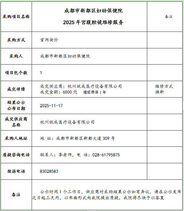 成都市新都区妇幼保健院 2025年宫腹腔镜维修服务询价结果公示